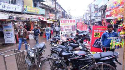 उज्जैन में महाकाल मंदिर के सामने मुख्य मार्ग पर आसपास के दुकान संचालक ग्राहकों के वाहनों को मुख्य सड़क पर पार्क करा रहे हैं