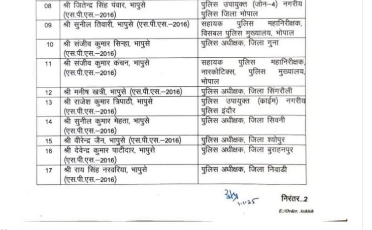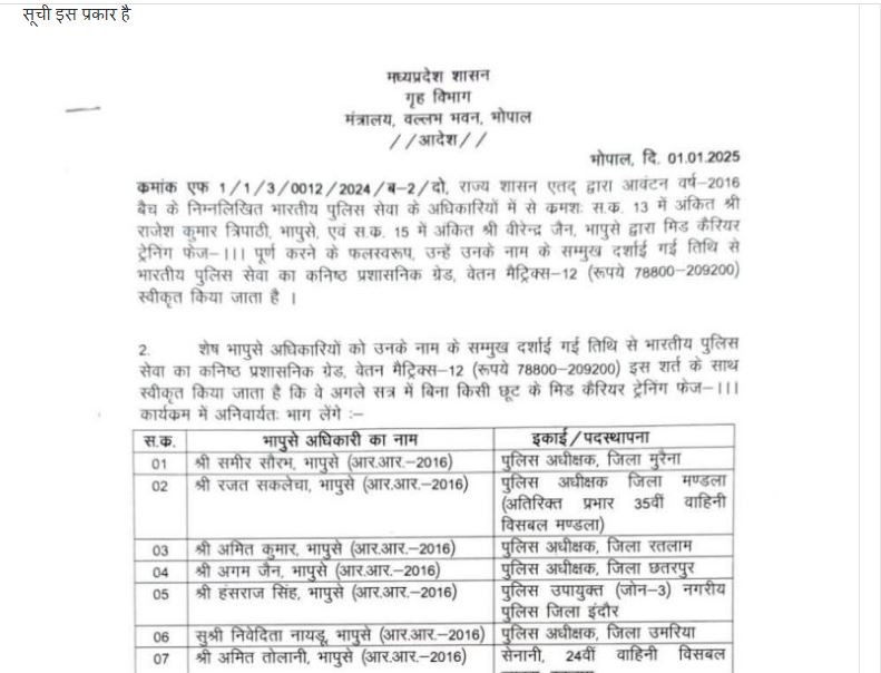 भोपाल। 27 पुलिस अधिकारियों को भारतीय पुलिस सेवा का कनिष्ठ प्रशासनिक ग्रेड स्वीकृत किया गया है। इस संबंध में आज आदेश जारी किए गए हैं।