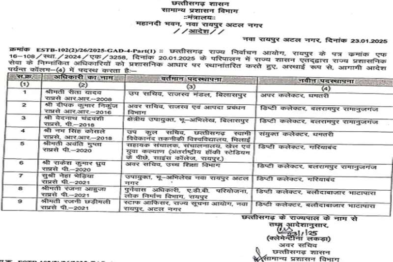 छत्तीसगढ़ में राज्य प्रशासनिक सेवा के अधिकारियों का ट्रांसफर, किसे कहां मिली पोस्टिंग?