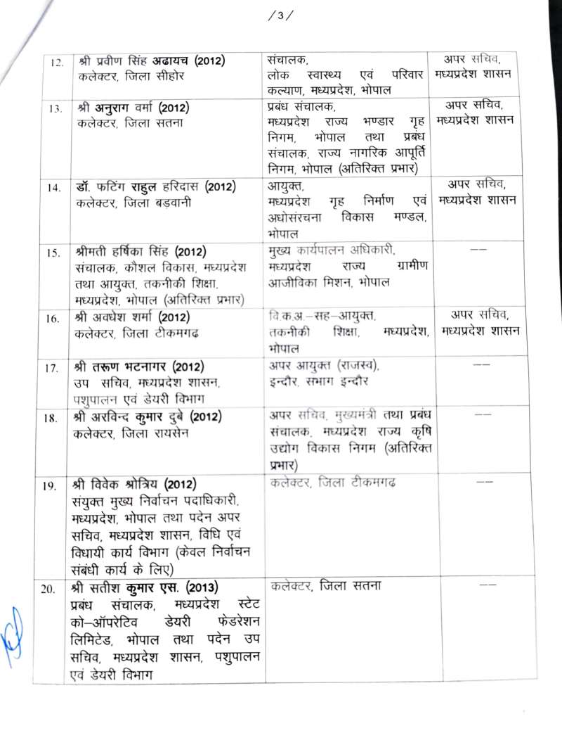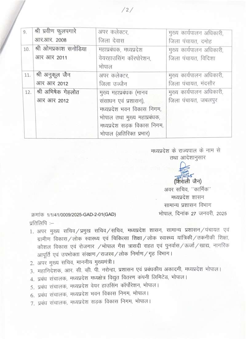 मुख्यमंत्री के सचिव भरत यादव को मध्य प्रदेश सड़क विकास निगम का प्रबंध संचालक बनाया गया है, जबकि उनके स्थान पर सीबी चक्रवर्ती एम को मुख्यमंत्री डॉ. मोहन यादव का सचिव बनाया गया है। इसी तरह आईएएस अधिकारी ललित कुमार को राजस्व मंडल ग्वालियर का सदस्य, अविनाश लवानिया को मध्य प्रदेश पावर मैनेजमेंट कंपनी लिमिटेड जबलपुर का प्रबंध संचालक, वंदना वेद को आदिम जाति क्षेत्र विकास योजना का संचालक, सत्येंद्र सिंह को एमपी स्टेट कोऑपरेटिव डेयरी फेडरेशन लिमिटेड का प्रबंध संचालक, मनीष सिंह को जेल और मध्य प्रदेश परिवहन विभाग का सचिव बनाया गया है। इसी तरह कलेक्टर खरगोन कर्मवीर शर्मा को आयुक्त सह संचालक खाद्य नागरिक आपूर्ति निगम की जिम्मेदारी दी गई है।