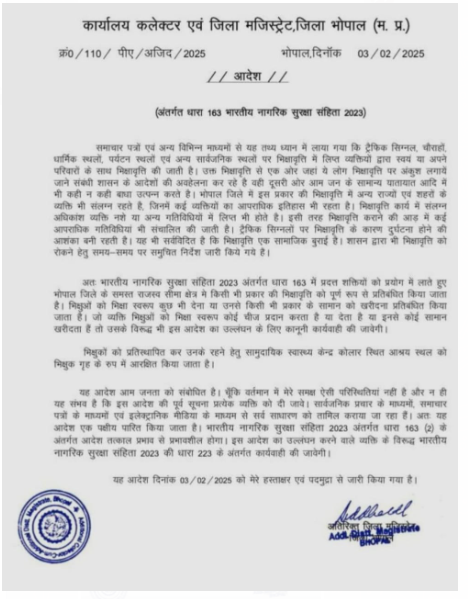 भोपाल । भोपाल में भीखारी को कोई व्यक्ति भीख स्वरूप कोई चीज प्रदान करता है या देता है या उनसे कोई सामान खरीदता है तो उसके खिलाफ कार्रवाई की जाएगी। इस संबंध में भाेपाल कलेक्टर कौशलेंद्र विक्रम सिंह ने आदेश जारी किए है। भोपाल कलेक्टर ने भारतीय नागरिक सुरक्षा संहिता 2023 अंतर्गत धारा 163 में प्रदत्त शक्तियों को प्रयोग में लाते हुए भोपाल जिले के समस्त राजस्व सीमा क्षेत्र में किसी भी प्रकार की भिक्षावृत्ति को पूर्ण रूप से प्रतिबंधित किया है। भिक्षुओं को भिक्षा स्वरूप कुछ भी देना या उनसे किसी भी प्रकार के सामान को खरीदना प्रतिबंधित किया गया है। जो व्यक्ति भिक्षुओं को भिक्षा स्वरूप कोई चीज प्रदान करता है या देता है या इनसे कोई सामान खरीदता हैं तो उसके विरूद्ध भी इस आदेश के उल्लंघन के लिए कानूनी कार्यवाही की जाएगी।