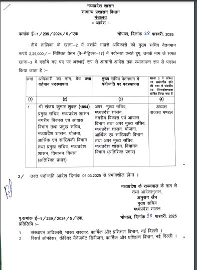 1994 बेच के IAS संजय शुक्ला, जो कि अभी मध्य प्रदेश शासन में प्रमुख सचिव पद पर कार्यरत हैं, उनको ACS के पद पर पदोन्नति प्रदान की गई है।