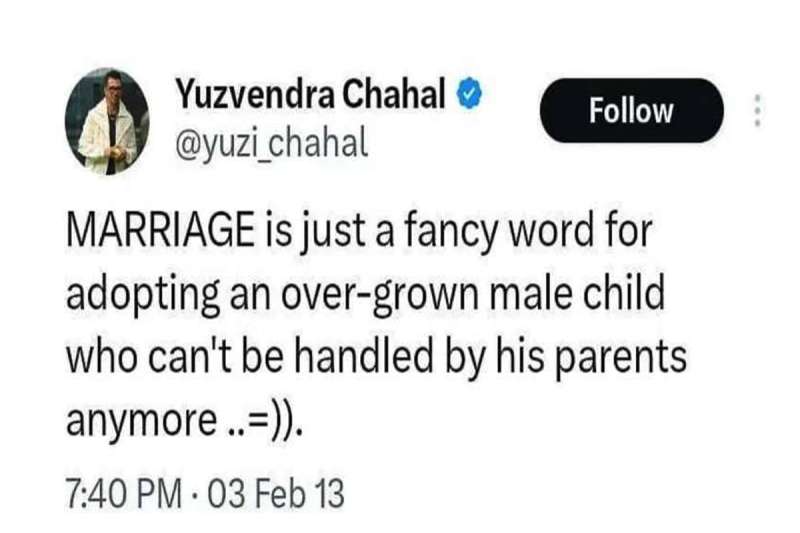 धनश्री वर्मा से तलाक के ठीक एक दिन बाद युजवेंद्र चहल का 2013 का पोस्ट सोशल मीडिया पर सामने आया, जिसमें उन्होंने शादी पर एक मजेदार और थोड़ा व्यंग्यात्मक कटाक्ष किया था, जिसमें उन्होंने सुझाव दिया था कि जब एक महिला शादी करती है, तो वह अनिवार्य रूप से अपने पति को 'गोद लेती है', जिसे एक बड़े बच्चे के रूप में चित्रित किया जाता है जिसे उसके माता-पिता अब संभाल नहीं सकते। पोस्ट में लिखा था, 'विवाह एक फैंसी शब्द है, जिसका मतलब है एक बड़े हो चुके बच्चे को गोद लेना, जिसके माता-पिता अब उसे संभाल नहीं सकते।'