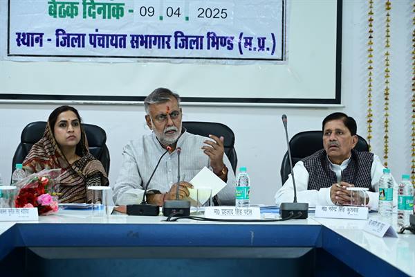 भोपाल : पंचायत एवं ग्रामीण विकास, श्रम मंत्री एवं भिंड जिले के प्रभारी मंत्री प्रहलाद सिंह पटेल की अध्यक्षता में बुधवार को जिला योजना समिति की बैठक जिला पंचायत सभागार भिण्ड में की गई। विधायक भिण्ड नरेन्द्र सिंह कुशवाह, विधायक गोहद केशव देसाई, जिला पंचायत अध्यक्ष श्रीमती कामना सिंह भदौरिया, कलेक्टर संजीव श्रीवास्तव, सीईओ जिला पंचायत सुनील दुबे, सहित अन्य अधिकारी, जनप्रतिनिधि उपस्थित रहे। बैठक का शुभारंभ राष्ट्रगान के साथ हुआ।