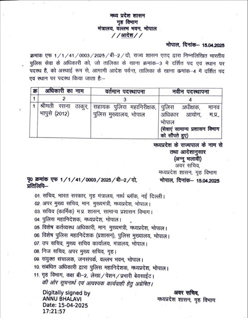 ठाकुर वर्तमान में पुलिस मुख्यालय भोपाल में सहायक महानिरीक्षक (एआईजी) के सहायक महानिरीक्षक (एआईजी) के रूप में काम कर रहे थे। नई पोस्टिंग में, उनका आरोप सामान्य प्रशासन विभाग को दिया गया है। यह आदेश मध्य प्रदेश के गवर्नर के नाम पर और अंडर सेक्रेटरी अन्नू भालवी के हस्ताक्षर के तहत जारी किया गया था।