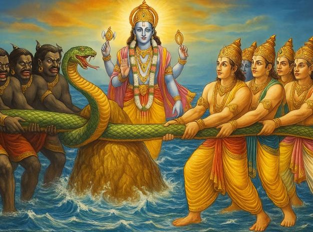 कमज़ोर हो चुके देवता राक्षसों से हारने लगे और डर के मारे उन्होंने भगवान विष्णु से सहायता मांगी. विष्णु ने बताया कि अगर वे क्षीर सागर को मथें, तो अमृत निकलेगा, जिसे पीकर वे अमर हो जाएंगे. लेकिन समुद्र मंथन करना आसान नहीं था, और देवता अब शक्तिहीन थे. इसीलिए इंद्र ने असुरों से मदद मांगी और उन्हें अमृत में हिस्सा देने का वादा किया. असुर लालच में मान गए.