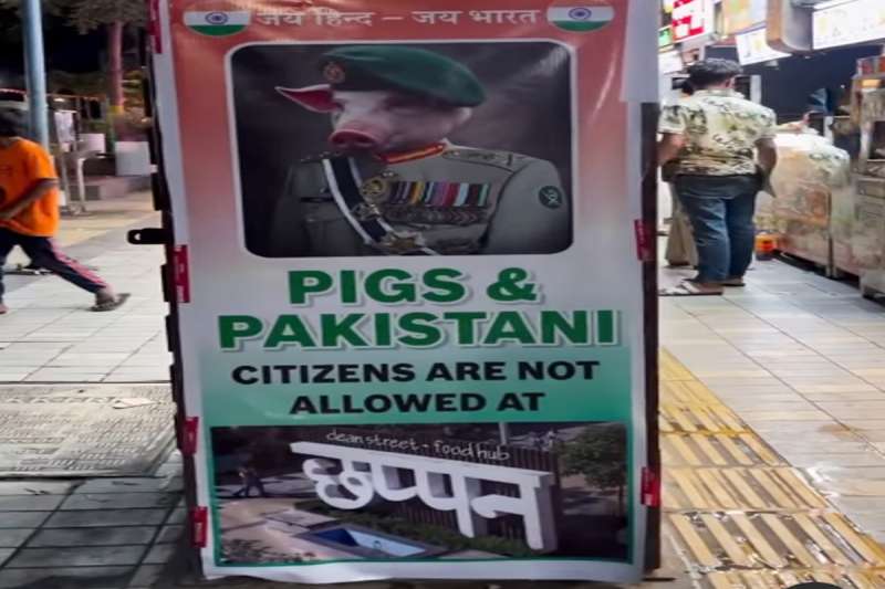 इंदौर: मंगलवार को जब पूरा देश पहलगाम में हुए आतंकी हमले पर शोक मना रहा था, उसी दौरान इंदौर में एक फूड स्टॉल के बाहर लगे साइनबोर्ड ने सबका ध्यान खींचा, जिस पर लिखा था, "छप्पन दुकान में सुअरों और पाकिस्तानी नागरिकों का प्रवेश वर्जित है।" इंदौर की मशहूर फूड स्ट्रीट छप्पन दुकान पर सुअर के चेहरे वाली पाकिस्तानी सेना प्रमुख असीम मुनीर की फर्जी तस्वीर छपी है। पोस्टर लोगों का ध्यान खींच रहा है और लोग सेल्फी लेने के लिए उमड़ पड़े हैं।