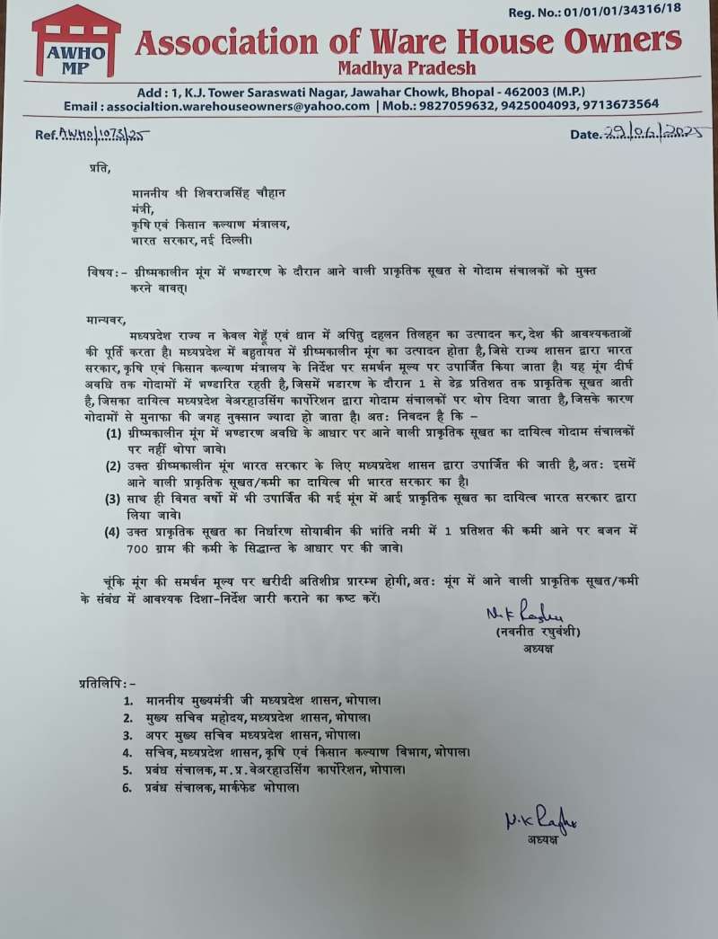 वेयरहाउस पर मूँग की समर्थन मूल्य पर शासकीय खरीदी में आने वाली समस्याओं से कराया अवगत।आज दिनाँक 29/6/2025 को मध्यप्रदेश वेयरहाउस ऑनर्स एसोसिएशन ने केंद्रीय कृषि मंत्री शिवराज सिंह चौहान को भोपाल निवास पर ज्ञापन दिया।एसोसिएशन ने बताया कि मूँग के भंडारण में प्राकृतिक रूप से 1.50℅ की सूखत आती है जिसके कारण वेयरहाउस संचालकों को नुकसान उठाना पड़ता है इस सूखत के हिसाब से संचालकों को छूट प्रदान की जाए, कई वर्षों से लंबित गेहू,चना, मूंग,धान,सोयाबीन आदि के किराए का भुगतान भी शीघ्र किया जाए।