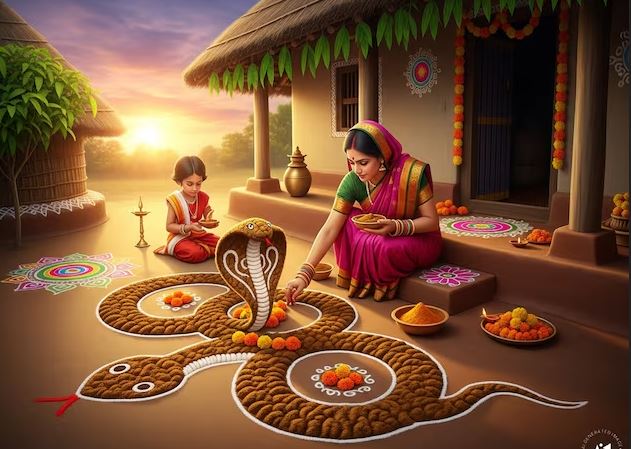 नाग पंचमी के दिन सुबह-सुबह लोग घरों के दरवाजे के दोनों ओर गाय के गोबर से नाग की आकृति बनाते हैं. यह परंपरा बहुत पुरानी है और इसे आज भी ग्रामीण इलाकों में खास तौर पर निभाया जाता है. इसके पीछे कुछ मान्यताएं हैं: