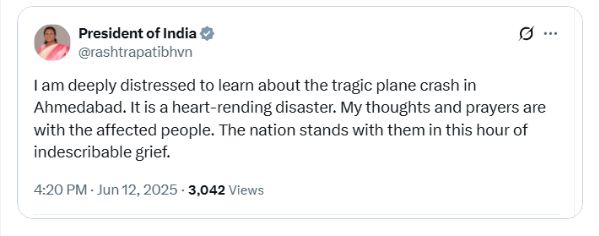 राष्ट्रपति द्रौपदी मुर्मू ने हादसे पर दुख व्यक्त करते हुए कहा कि मैं अहमदाबाद में दुखद विमान दुर्घटना के बारे में जानने के लिए गहराई से व्यथित हूं. यह एक हृदय-संबंधी आपदा है. मेरे विचार और प्रार्थनाएं प्रभावित लोगों के साथ हैं. राष्ट्र अवर्णनीय दुःख में उनके साथ खड़ा है