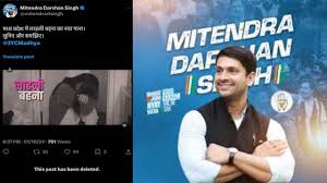 ग्वालियर । युवा कांग्रेस प्रदेशध्यक्ष मितेंद्र सिंह के खिलाफ एफआईआर, क्राइम ब्रांच थाने में दर्ज हुई एफआईआर, धार 353 (2), 356 (2) के तहत दर्ज, मितेंद्र सिंह ने अपने X पर की पोस्ट, लाड़ली बहना योजना का भ्रामक वीडियो सोशल मीडिया पर पोस्ट का आरोप, वीडियो के जरिए शांति व्यवस्था बिगाड़ने का आरोप, प्रदेश को राष्ट्रीय स्तर पर बदनाम करने का आरोप धर्मेंद्र नायक ने दर्ज कराई है एफआईआर। धार 353 (2)- अगर कोई व्यक्ति जानबूझकर किसी धर्म या जाति के बारे में गलत जानकारी, अफवाह या चौंकाने वाली खबरें बनाता है या उसे बढ़ावा देने के जुर्म का दोषी पाया जाता है तो उसे तीन साल तक की जेल व जुर्माने की सजा दी जा सकती है। 356 (2)- कोई भी व्यक्ति मानहानि के अपराध का दोषी पाया जाता है उसे सजा के तौर पर दो साल तक की जेल व जुर्माने से दंडित किया जा सकता है।