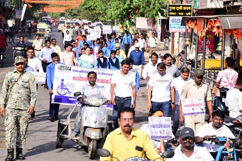 इस मतदाता जागरूकता रैली में दिव्यांगों ने लोगों से मतदान की अपील करते हुए नारा लगाया कि छोड़ कर अपने सारे काम, पहले करें मतदान। यह रैली जिला कार्यालय से शुरू होकर तिलक नगर स्थित स्वामी आत्मानंद स्कूल में समाप्त हुई। इस रैली में नगर निगम कमिश्नर अमित कुमार, जिला पंचायत सीईओ एवं स्वीप के नोडल अधिकारी रामप्रसाद चैहान, एसडीएम पीयूष तिवारी, तहसीलदार अतुल वैष्णव, शशिभूषण सोनी, दिव्यांग आइकॉन लोक कलाकार लीलाधर भांगे, बड़ी संख्या में दिव्यांग बच्चों और दिव्यांगजनों नेे भाग लिया।