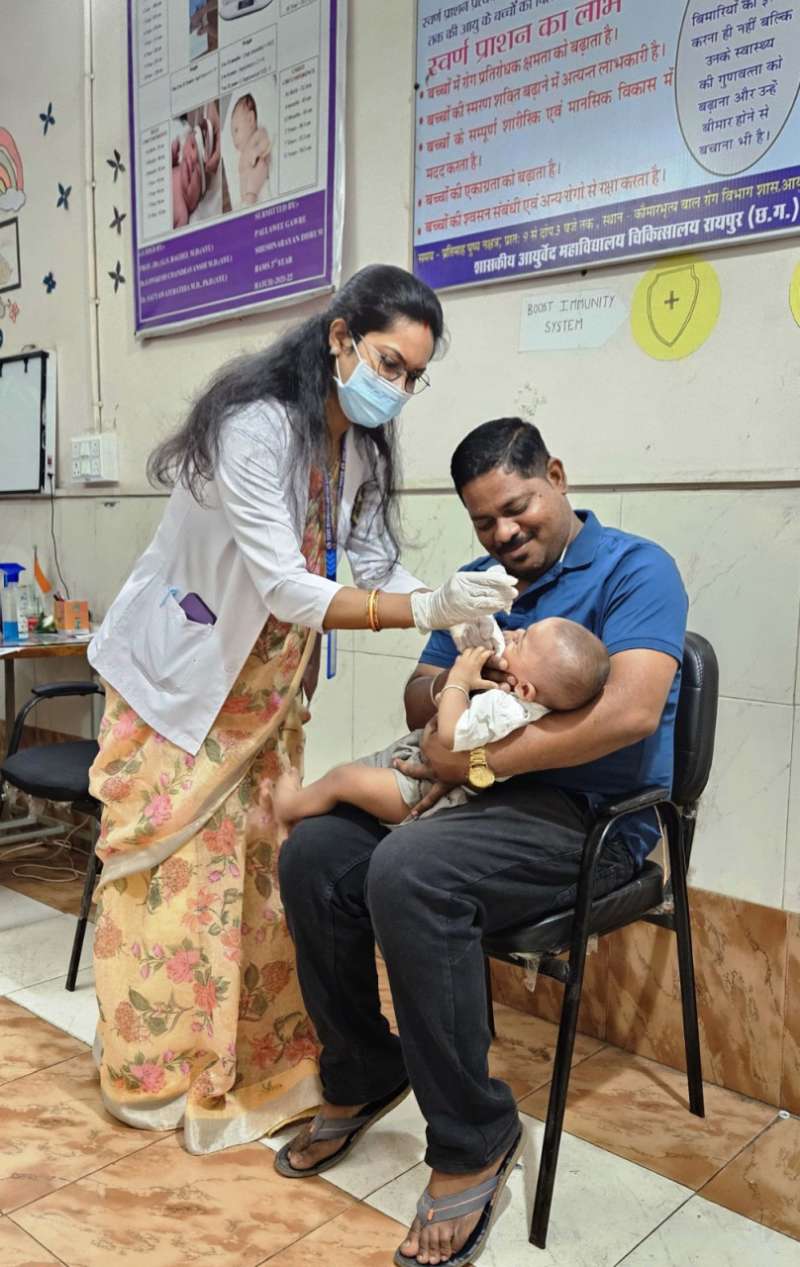 रायपुर : बच्चों के व्याधिक्षमत्व, पाचन शक्ति, स्मरण शक्ति, शारीरिक शक्तिवर्धन एवं रोगों से बचाव के लिए शासकीय आयुर्वेद महाविद्यालय चिकित्सालय, रायपुर में शनिवार को 1982 बच्चों को स्वर्णप्राशन कराया गया। आयुर्वेद महाविद्यालय चिकित्सालय के कौमारभृत्य विभाग द्वारा हर पुष्य नक्षत्र तिथि में शून्य से 16 वर्ष के बच्चों को स्वर्णप्राशन कराया जाता है। यह बच्चों के व्याधिक्षमत्व, पाचन शक्ति, स्मरण शक्ति, शारीरिक शक्तिवर्धन एवं रोगों से बचाव में बहुत लाभदायक और उपयोगी है। स्वर्णप्राशन के साथ ही डॉ. लवकेश चंद्रवंशी ने बच्चों के स्वास्थ्य का परीक्षण किया।