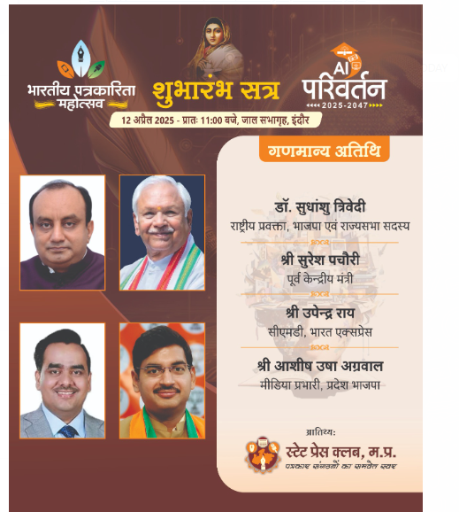 इंदौर। स्टेट प्रेस क्लब, म.प्र. द्वारा 12, 13 एवं 14 अप्रैल को जाल सभागृह में भारतीय पत्रकारिता महोत्सव का आयोजन किया जा रहा है। यह महोत्सव का 17वां वर्ष है। इस मर्तबा महोत्सव की थीम एआई और परिवर्तन 2047 रखी गई है। 72 घण्टे के इस विशिष्ठ आयोजन में प्रिंट, इलेक्ट्रानिक और डिजिटल मीडिया के 100 से अधिक पत्रकार भाग लेंगे। मूर्धन्य सम्पादक श्री राहुल बारपुते, श्री राजेन्द्र माथुर, श्री प्रभाष जोशी, श्री माणिकचंद वाजपेयी, श्री रमेशचंद्र अग्रवाल, श्री अभय छजलानी एवं डॉ. वेद प्रताप वैदिक की स्मृति में आयोजित इस पत्रकारिता पर्व में छ: वैचारिक सत्र और तीन मास्टर क्लास का आयोजन होगा। महोत्सव के अंतगर्त मध्यप्रदेश के धार्मिक एवं पर्यटन स्थलों पर केन्द्रीत छायाचित्र प्रदर्शनी एवं एआई पर एकाग्र चित्रकला प्रदर्शनी 'छवि नए युग कीÓ का आयोजन भी किया गया है। महोत्सव के दौरान एआई के विभिन्न स्वरूपों पर केन्द्रीत 150 पृष्ठों की उद्देश्यपूर्ण स्मारिका भी प्रकाशित की जाएगी।